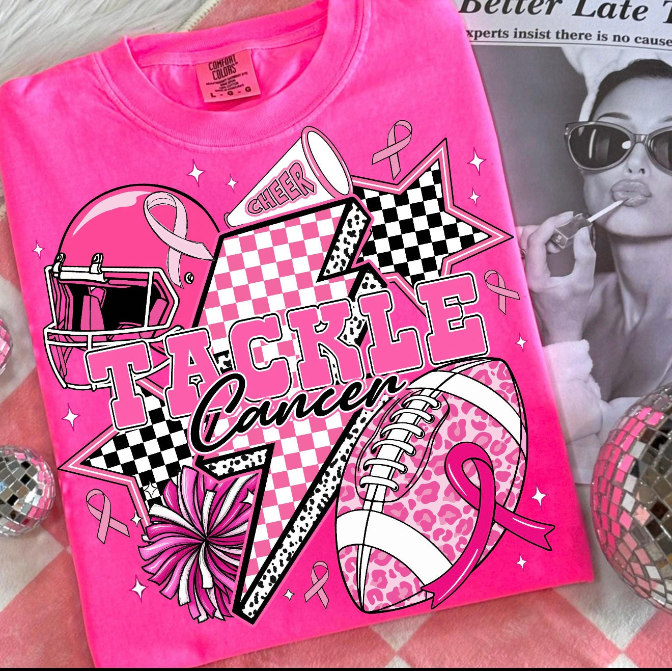 Show your strength and support with our “Tackle Cancer” Tee/Crewneck. Offered in a bold pink Comfort Colors teeor a cozy pink crewneck sweatshirt, this piece is designed to spread awareness while keeping you comfortable. With its athletic-inspired Tackle Cancer graphic, it’s the perfect way to stand united in the fight against breast cancer.